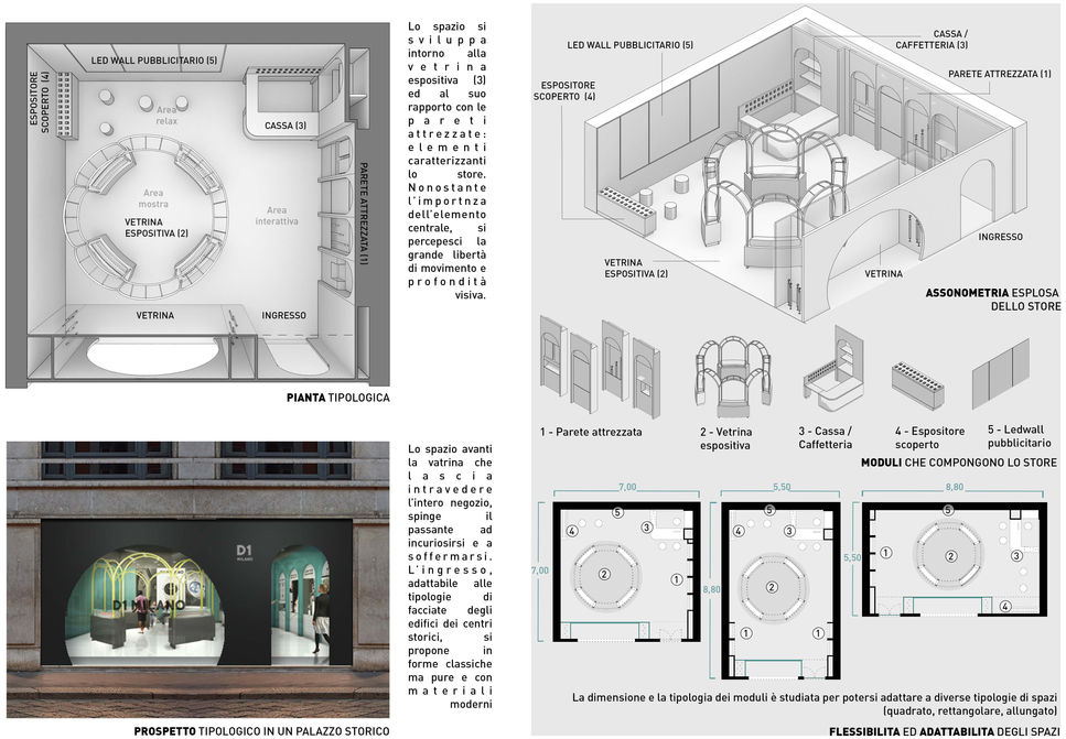 Il layout del design rispecchia la filosofia del Brand , che adotta un concept che valorizza l’esposizione del prodotto con l’obiettivo di offrire al cliente una shopping experience dedicata. Esso si genera proprio dalla geometria essenziale dell’orologio D1 Milano. La visione finale degli elementi modulari è quella poi di una ideale piazza italiana con un riferimento esplicito al nome del prodotto, costruita su elementi armonici e puri, ma in questo caso sorpendenti perchè sempificati, texturizzati, con forte impatto tecnologico.